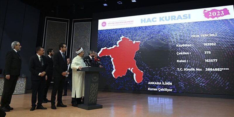 “2023’te, 2022’de 65 yaşından büyük olması ve aşı sebebiyle gidemeyen 34 bin 443 hacı adayımız kurasız bir şekilde hac ibadetini bu sene yapacaklardır. Ülkemize tanınan hac kotasının geriye kalan kısmı için ise ön kayıt yaptıran vatandaşlarımızın arasından, hac konaklama tercihleri ve ön kayıt yaptırdıkları yıllar ve kayıt sayısı oranları da esas alınarak kat sayılı bir şekilde kura çekilecektir.”