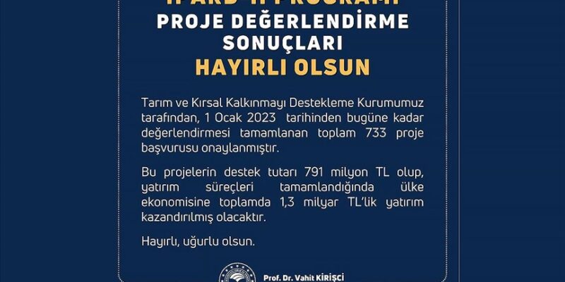 Tarım ve Kırsal Kalkınmayı Destekleme Kurumu tarafından, 1 Ocak 2023’ten bugüne kadar değerlendirmesi tamamlanan toplam 733 proje başvurusunun onaylandığını belirten Kirişci, “Bu projelerin destek tutarı 791 milyon lira olup, yatırım süreçleri tamamlandığında ülke ekonomisine toplamda 1,3 milyar liralık yatırım kazandırılmış olacaktır. Hayırlı uğurlu olsun.” ifadelerini kullandı.