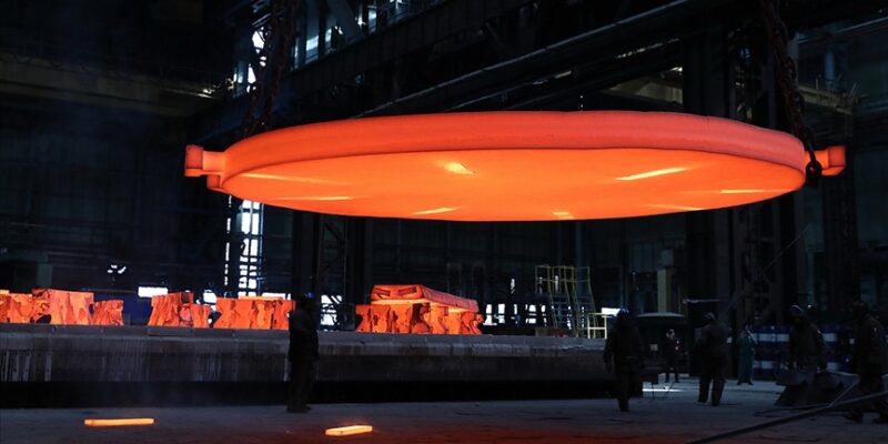 “İlk olarak boru şeklinde bir dövme çelik, metal levha elde etmek için Atommash’ın termal pres alanında preslenerek açıldı. İkinci aşamada ise taban şekillendirildi. 64 ton ağırlığında ve 300 milimetre kalınlığında olan yuvarlak tabaka, 6 saat boyunca üç aşamalı olarak maksimum 1020 derece ısıya tabi tutuldu. Ardından tabaka, bir vinç yardımıyla kalıba yerleştirilerek 10 bin ton/kuvvetlik baskı gücüyle preslendi.”