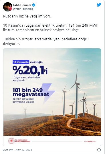 Enerji ve Tabii Kaynaklar Bakanı Fatih Dönmez, Twitter hesabından yaptığı açıklamada, söz konusu tarihte toplam elektrik üretiminde rüzgarın payının yüzde 20,1 olduğunu kaydetti.