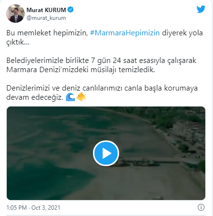 Bakan Kurum, videodaki mesajında, Marmara’nın masmavi denizinde görüntü kirliliğine sebebiyet veren ve deniz dibindeki ekolojik yaşamı tehdit eden müsilaja ilişkin adımları hızlı şekilde attıklarını ve projeleri de kararlılıkla hayata geçirdiklerini vurguladı.