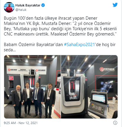 Bayraktar, “Bugün 100’den fazla ülkeye ihracat yapan Dener Makina’nın Yönetim Kurulu Başkanı Mustafa Dener: ‘2 yıl önce Özdemir Bey, ‘Mutlaka yap bunu.’ dediği için Türkiye’nin ilk 5 eksenli CNC makinasını ürettik. Maalesef Özdemir Bey göremedi.’ Babam Özdemir Bayraktar’dan #SahaExpo2021’de hoş bir seda…” ifadesini kullandı.