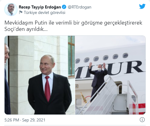 Cumhurbaşkanı Recep Tayyip Erdoğan, sosyal medya hesabından, “Mevkidaşım Putin ile verimli bir görüşme gerçekleştirerek Soçi’den ayrıldık.” paylaşımında bulundu.