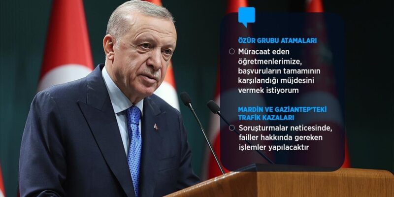 Son kabine toplantısından bu yana Türkiye ve milleti ilgilendiren pek çok çalışma yaptıklarını belirten Erdoğan, Yüksek Askeri Şura Toplantısı’nda Kara, Deniz ve Hava Kuvvetlerindeki terfileri görüşüp karara bağladıklarını, ardından da görevlendirmeleri yaptıklarını hatırlattı.