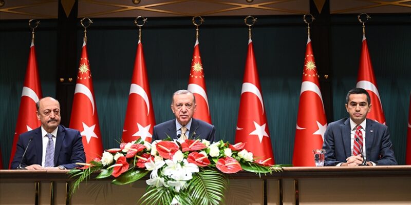 Cumhurbaşkanı Recep Tayyip Erdoğan, 2023’te uygulanacak asgari ücreti açıklamak üzere Çalışma ve Sosyal Güvenlik Bakanı Vedat Bilgin ve Türkiye İşveren Sendikaları Konfederasyonu (TİSK) Yönetim Kurulu Başkanı Özgür Burak Akkol’un da katılımıyla Cumhurbaşkanlığı Külliyesi’nde basın toplantısı düzenledi.