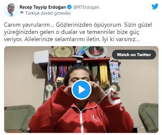 Cumhurbaşkanı Erdoğan, Twitter hesabından yaptığı paylaşımda, kendisine ve eşi Emine Erdoğan’a video mesaj ile dua ederek, geçmiş olsun temennisinde bulunan Türkiye’nin çeşitli illerindeki özel sporculara, “Canım yavrularım… Gözlerinizden öpüyorum. Sizin güzel yüreğinizden gelen o dualar ve temenniler bize güç veriyor. Ailelerinize selamlarımı iletin. İyi ki varsınız…” ifadelerini kullandı.