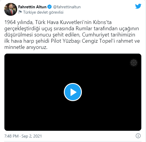 Cumhurbaşkanlığı İletişim Başkanı Fahrettin Altun, Türk Hava Kuvvetlerinin Kıbrıs‘ta gerçekleştirdiği uçuş sırasında Rumlar tarafından uçağının düşürülmesi sonucu 1964’te şehit edilen, Cumhuriyet tarihinin ilk hava harp şehidi Pilot Yüzbaşı Cengiz Topel‘i rahmet ve minnetle andı.