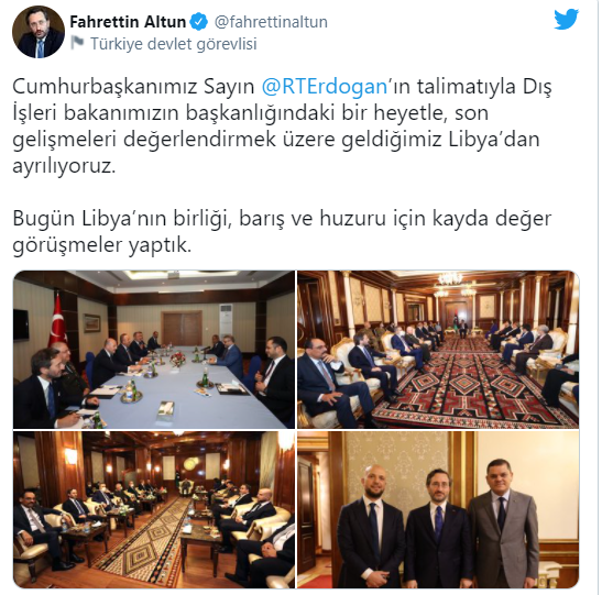 Cumhurbaşkanlığı İletişim Başkanı Fahrettin Altun, Twitter hesabından yaptığı paylaşımda, “Cumhurbaşkanımız Sayın Recep Tayyip Erdoğan’ın talimatıyla Dışişleri Bakanımızın başkanlığındaki bir heyetle, son gelişmeleri değerlendirmek üzere geldiğimiz Libya’dan ayrılıyoruz. Bugün Libya’nın birliği, barış ve huzuru için kayda değer görüşmeler yaptık.” ifadelerini kullandı.
