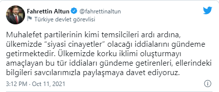 Cumhurbaşkanlığı İletişim Başkanı Fahrettin Altun, sosyal medya hesabından yaptığı açıklamada, muhalefet partilerinin kimi temsilcilerinin ardı ardına, ülkede “siyasi cinayetler” olacağı iddialarını gündeme getirdiklerini belirtti.