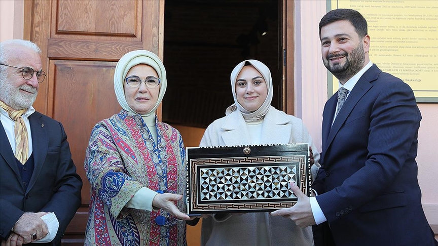 Emine Erdoğan, daha sonra belediyenin sedef atölyesine de uğradı ve bu sanatın yapımıyla ilgili bilgi aldı.