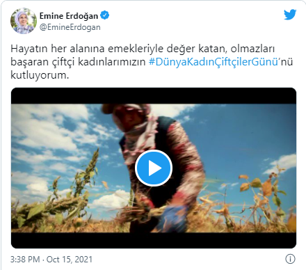 Emine Erdoğan, Twitter hesabından yaptığı paylaşımda, “Hayatın her alanına emekleriyle değer katan, olmazları başaran çiftçi kadınlarımızın Dünya Kadın Çiftçiler Günü‘nü kutluyorum.” ifadelerini kullandı.