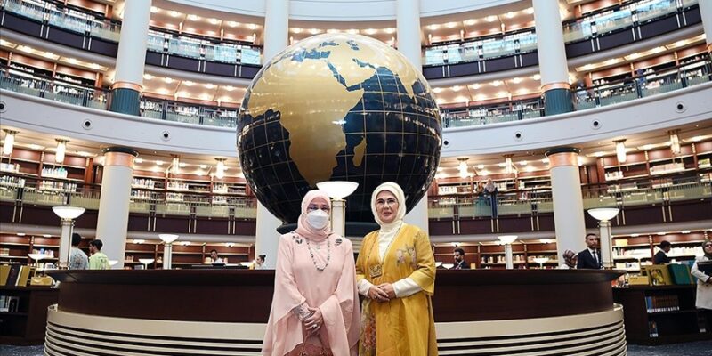Emine Erdoğan, Cumhurbaşkanı Erdoğan’ın davetlisi olarak Ankara’ya gelen Malezya Kralı Sultan Abdullah Ri’ayatuddin Al-Mustafa Billah Şah’ın eşi Kraliçe Tunku Azizah ile Cumhurbaşkanlığı Millet Kütüphanesi’ni ziyaret etti.