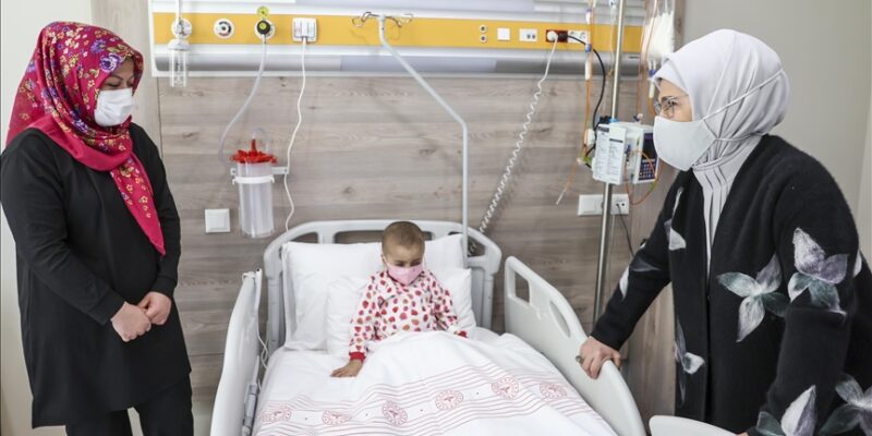 Sağlık Bakanı Fahrettin Koca’nın eşlik ettiği ziyarette Emine Erdoğan, çocukların sağlık durumu ve tedavi süreci hakkında Çocuk Hastanesi Başhekimi Doç. Dr. Ferit Kulalı’dan bilgi aldı.