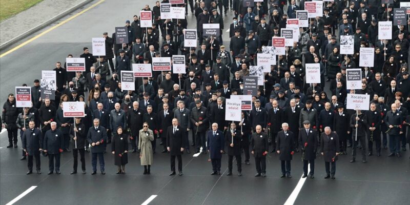 Azadlık Meydanı’nda başlayan, devlet erkanının yanı sıra yüzlerce kişinin katıldığı yürüyüşte, katliam kurbanlarının fotoğraflarının bulunduğu pankartlar taşındı. Ana Feryadı Anıtı’nda sona eren yürüyüşün ardından düzenlenen törende Cumhurbaşkanı Aliyev, anıta çelenk bıraktı.