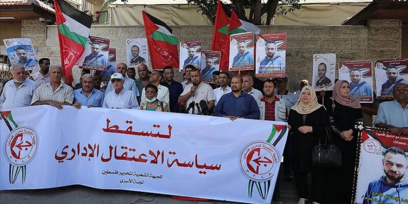 Filistin Halk Kurtuluş Cephesi (FHKC) tarafından Gazze’deki Uluslararası Kızıl Haç Komitesi (ICRC) binası önünde düzenlenen gösteriye katılan Filistinliler, İsrail’in “idari tutukluluk” uygulamasının sona ermesini talep eden afişler açtı.