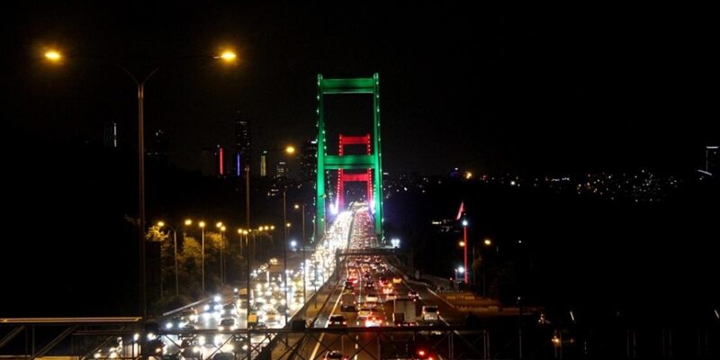 Önemli günlerde renk ve ışık gösterileriyle aydınlatılan köprüler, bu kez Tacikistan bayrağının renkleri olan yeşil, kırmızı ve beyaza büründü.