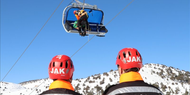 Ekiplerin merkezde yaptığı bir başka tatbikatta ise telesiyejde mahsur kalan kayakçıya hızlı şekilde ulaşıldı.