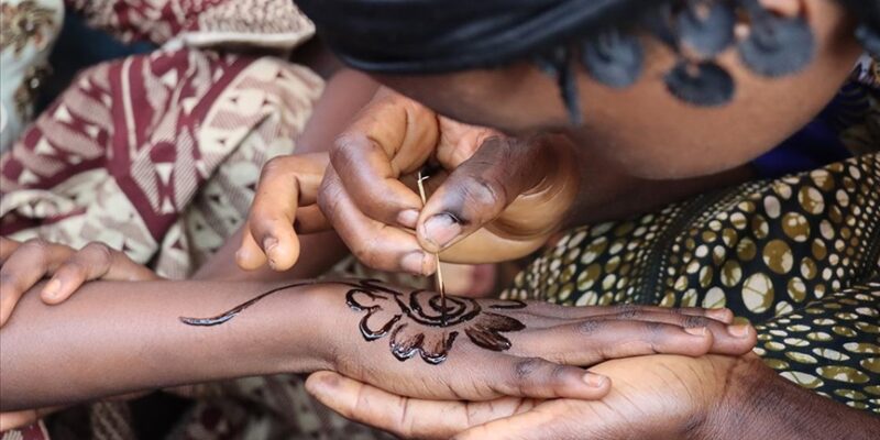 Kamerun’da halk, ramazan ve kurban gibi dini bayramlara, gençlik bayramı gibi ulusal bayramlara ulaşmanın mutluluğunu vücutlarına kına yakarak gösteriyor.