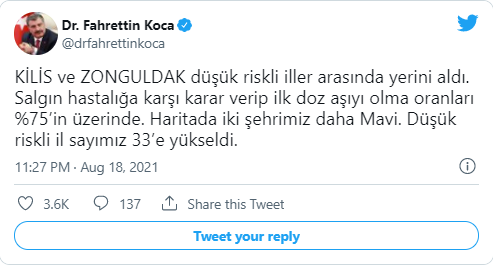 Sağlık Bakanı Fahrettin Koca, sosyal medya hesabından yaptığı paylaşımda, “Kilis ve Zonguldak, düşük riskli iller arasında yerini aldı. Salgın hastalığa karşı karar verip ilk doz aşıyı olma oranları yüzde 75’in üzerinde. Haritada iki şehrimiz daha mavi. Düşük riskli il sayımız 33’e yükseldi.” ifadelerini kullandı.