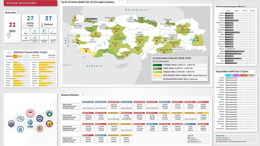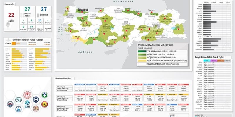 Tarım ve Orman Bakanlığına bağlı Türkiye Su Enstitüsü Başkanlığı (SUEN) koordinasyonunda yürütülen “Türkiye Genelinde Kovid-19 Yayılımının Atık Sularda SARS-CoV-2 Analizleri ile Takibi” projesi kapsamında, ülke genelinde 22 ildeki atık su tesislerinden alınan numuneler analiz edildikten sonra virüsün Türkiye’deki bölgesel yayılımı haritalandırılarak “covid19.tarimorman.gov.tr” adresinden yayımlanıyor.