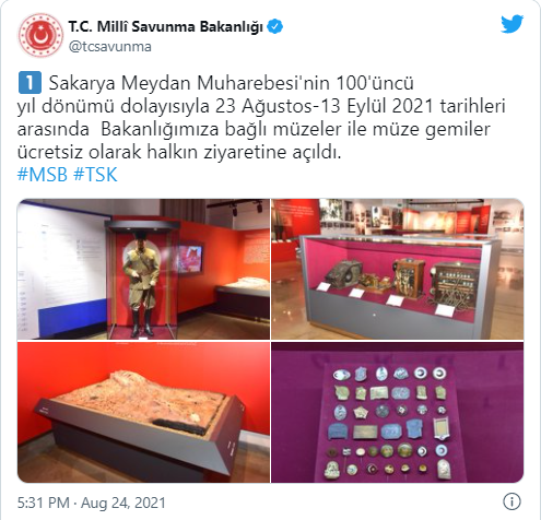 “Sakarya Meydan Muharebesi’nin 100’üncü yıl dönümü dolayısıyla 23 Ağustos-13 Eylül 2021 tarihleri arasında Bakanlığımıza bağlı müzeler ile müze gemiler ücretsiz olarak halkın ziyaretine açıldı. Harbiye Askeri Müzesi’nde de Başkomutanımız Gazi Mustafa Kemal Atatürk ile Sakarya Meydan Muharebesi’nde görev yapan muzaffer Türk komutanların silah, teçhizat ve eşyalarından oluşan 52 tarihi eşya ile askeri kültür varlıkları da ziyaretçiler için sergileniyor.”
