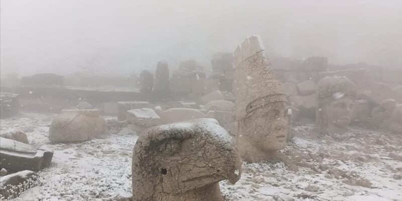 Milli Park Alanı olarak korumaya alınan ve eşsiz heykellerin yanı sıra 2 bin 150 metre yüksekliğiyle “Güneşin doğuşunun ve batışının en güzel izlendiği yer” olarak bilinen Nemrut Dağı’nda kar yağışıyla kartpostallık görüntüler ortaya çıktı.