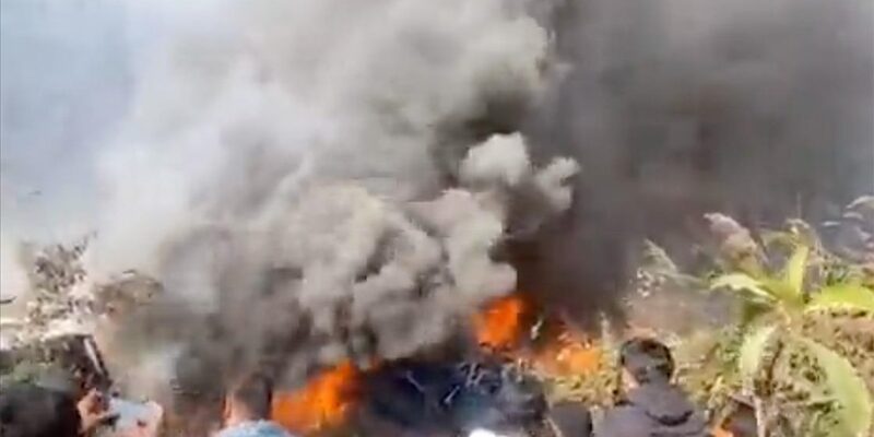 Devlet televizyonun yayınladığı görüntülerde, Himalaya Dağları’nın eteğindeki sarp bölgede düşen uçaktan alev ve dumanların çıkması yer aldı.