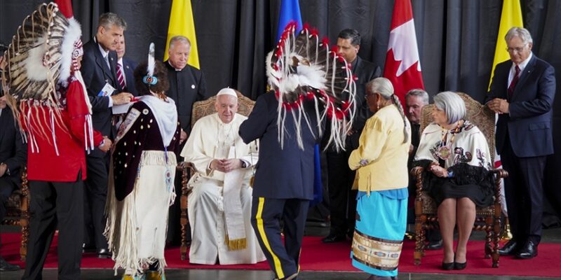 Kanada ziyaretini “tövbe haccı” olarak tanımlayan Papa, gezisinin ilk durağı olan Edmonton kentinde, yerli halkın liderleri, yatılı kilise okullarından sağ kurtulanlar ve siyasilerle halka açık bir etkinliğe katıldı.
