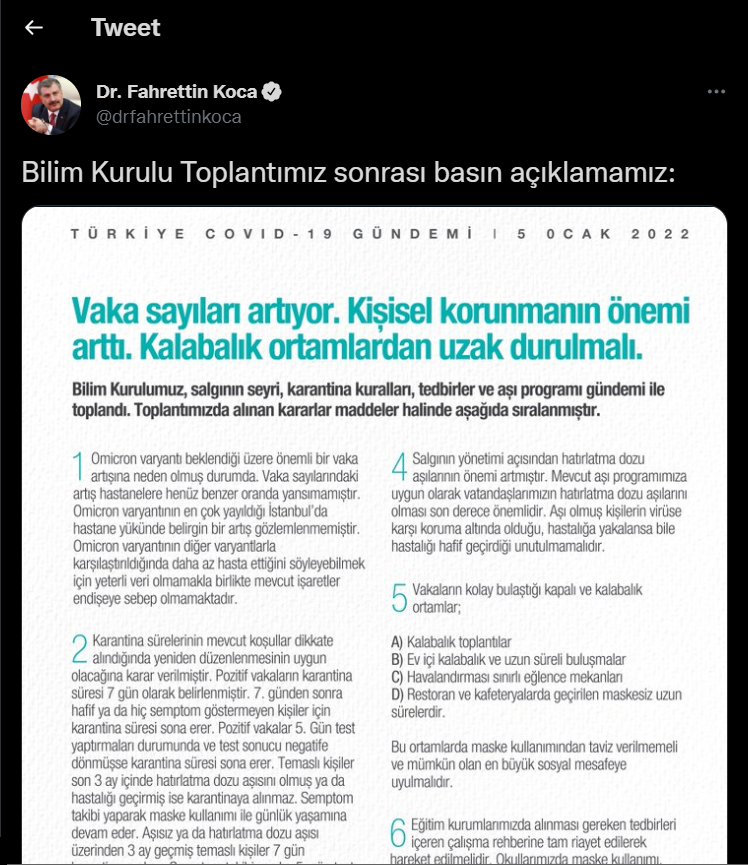 Kurulun, salgının seyri, karantina kuralları, tedbirler ve aşı programı gündemiyle toplandığını aktaran Koca, Omicron varyantının beklendiği gibi önemli vaka artışına neden olduğunu aktardı.
