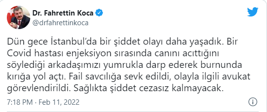 “Dün gece İstanbul’da bir şiddet olayı daha yaşadık. Bir Kovid hastası, enjeksiyon sırasında canını acıttığını söylediği arkadaşımızı yumrukla darbederek burnunda kırığa yol açtı. Fail savcılığa sevk edildi, olayla ilgili avukat görevlendirildi. Sağlıkta şiddet cezasız kalmayacak.”