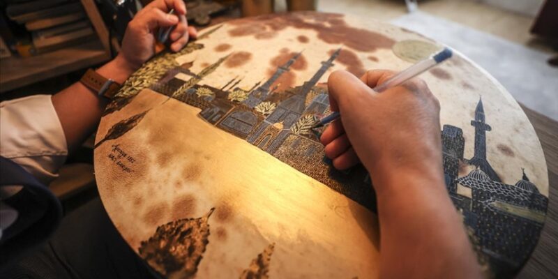 “Yeni Delhi’deki Kuvvet-ül Camisi’ni gördüğüm zaman ‘Böyle bir cami var ve ben yeni öğreniyorum’ diye hayıflandım. Pakistan’daki Vezirhan Camisi’ndeki süslemeleri görünce ‘Neden daha önce öğrenemedim’ diye hayıflandım. Bunlar hep beni keşfetmeye, araştırmaya itti. Bu anlamda bir resim sergisi açmanın doğru olacağını düşündüm. Bu resim sergisinde de deri üzerinde çalışmayı tercih ettim. Ben ebru ve el yapımı kağıtlar üzerinde de çalıştım ancak deri üzerinde özel bir sonuç aldığımı düşünüyorum. Deri kadim bir geleneğin mirasıdır, Kur’an’ı Kerim’in yazılması, birçok İslami eserin deri üzerine yazılması gibi.”