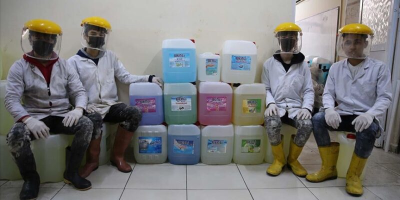 Haftanın 5 günü 8 öğretmen ve 70 öğrenciyle adeta fabrika gibi çalışan okulun atölyelerinde yüzey temizleyiciden sabuna, kolonyadan dezenfektana kadar çok çeşitli hijyen malzemeleri üretiliyor.
