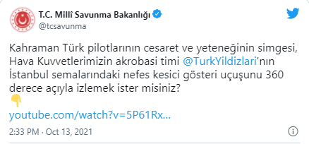 Milli Savuma Bakanlığının (MSB), Twitter hesabından yapılan paylaşımda, “Kahraman Türk pilotlarının cesaret ve yeteneğinin simgesi, Hava Kuvvetlerimizin akrobasi timi Türk Yıldızları’nın İstanbul semalarındaki nefes kesici gösteri uçuşunu 360 derece açıyla izlemek ister misiniz?” ifadeleri kullanıldı.