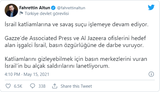 Altun, Twitter hesabından yaptığı paylaşımda, “İsrail, katliamlarına ve savaş suçu işlemeye devam ediyor. Gazze’de Associated Press ve Al Jazeera ofislerini hedef alan işgalci İsrail, basın özgürlüğüne de darbe vuruyor. Katliamlarını gizleyebilmek için basın merkezlerini vuran İsrail’in bu alçak saldırılarını lanetliyorum.” ifadelerini kullandı.