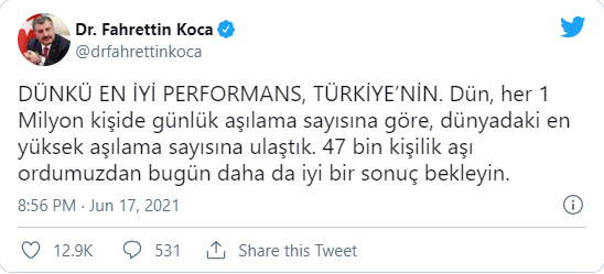 Sağlık Bakanı Fahrettin Koca, sosyal medya hesabından yaptığı paylaşımda, “Dünkü en iyi performans Türkiye’nin. Dün, her 1 milyon kişide günlük aşılama sayısına göre, dünyadaki en yüksek aşılama sayısına ulaştık. 47 bin kişilik aşı ordumuzdan bugün daha da iyi bir sonuç bekleyin.” ifadelerini kullandı.
