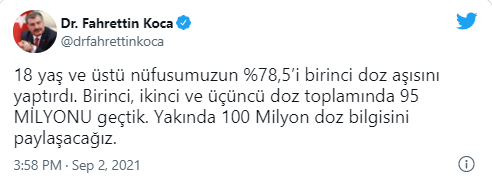Sağlık Bakanlığının “covid19asi.saglik.gov.tr” sitesinde yer alan anlık verilere göre, 2 Eylül Perşembe saat 09.50 itibarıyla 48 milyon 616 bin 804 birinci doz, 37 milyon 427 bin 546 ikinci doz aşı uygulandı. Diğer dozlarla birlikte toplam yapılan doz sayısı, 95 milyon 11 bin 116 oldu.