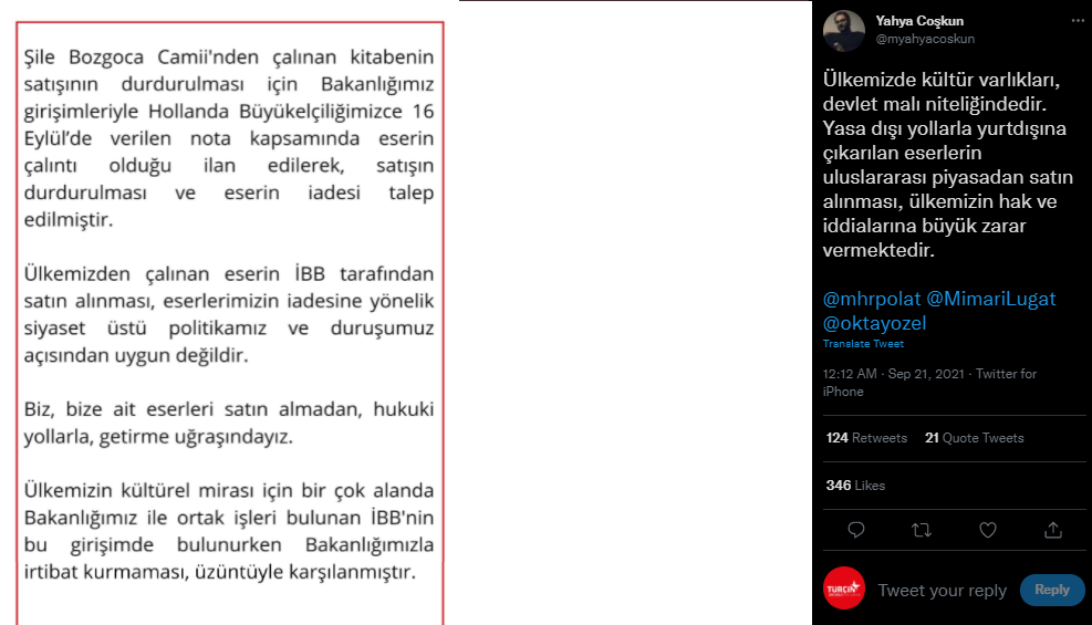 Şile Bozgoca Camisi’nden çalınan kitabenin satışının durdurulması için Kültür ve Turizm Bakanlığının girişimleriyle Hollanda Büyükelçiliğince 16 Eylül’de nota verildiğini bildiren Coşkun, eserin çalıntı olduğunun ilan edildiğini, satışın durdurulmasının ve eserin iadesinin istendiğini açıkladı.