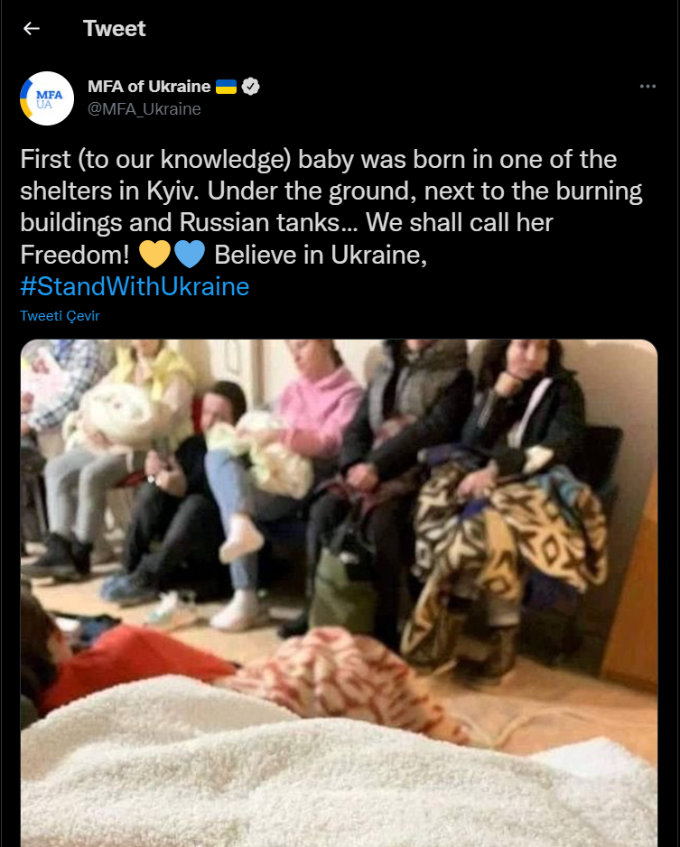 Paylaşımda, “Kiev’deki sığınaklardan birinde (bildiğimize göre) ilk bebek dünyaya geldi. Yerin altında, yanan binaların ve Rus tanklarının yanında.” ifadeleri kullanıldı.
