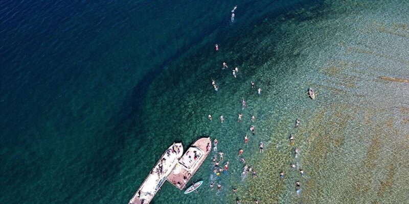 Çevre ilçelerden de yoğun katılımın olduğu festivalde, yüzücüler 2,5 kilometre mesafeyi yüzüp Adır Adası’na çıktı.